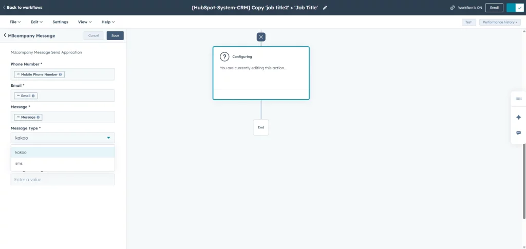 허브스팟에서는 공식적으로 국내에서 문자 메시지 발송 및 카카오톡 서비스를 지원하지 않습니다.
