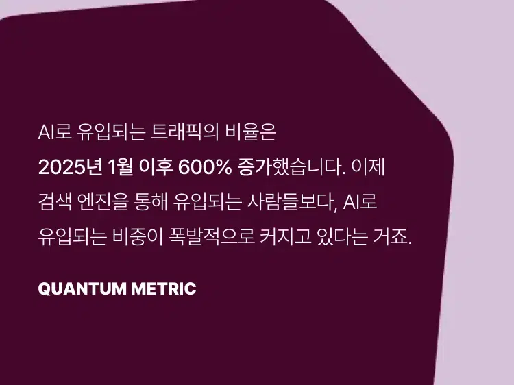 - AI로 유입되는 트래픽의 비율은 2025년 1월 이후 600% 증가했습니다. 이제 검색 엔진을 통해 유입되는 사람들보다, AI로 유입되는 비중이 폭발적으로 커지고 있다는 거죠.