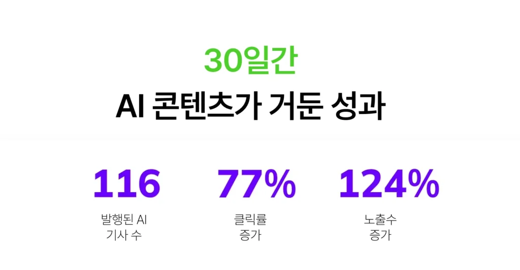 이 기간 동안AI로 뽑은 기사 제목이 CTR을 59% 끌어올리며, 기존의 기사 제목보다 더 뛰어난 성과를 거두었습니다. 이 결과를 보면 AI 콘텐츠도 좋은 성과가 난다는 걸 알 수 있습니다. 단, AI 답변을 그대로 쓰기보다 다듬는 과정이 더 중요했고, 최적화 작업에도 사람이 필요했습니다.