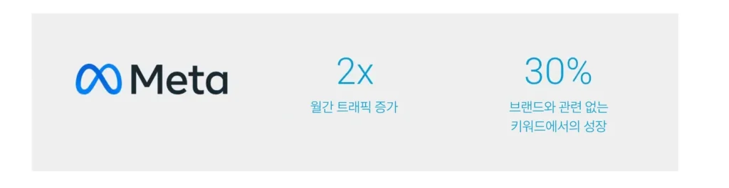 키워드 기획도 마찬가지입니다. Meta는 AI 기반 SEO 도구를 활용해 브랜드와 관련 없는 키워드를 타겟팅하는 식으로 월간 검색 트래픽을 두 배로 늘렸습니다. AI 기반의 웹사이트 진단으로 깨진 링크, 누락된 메타데이터, 느린 페이지 로딩 속도와 같은 문제도 개선하고요.