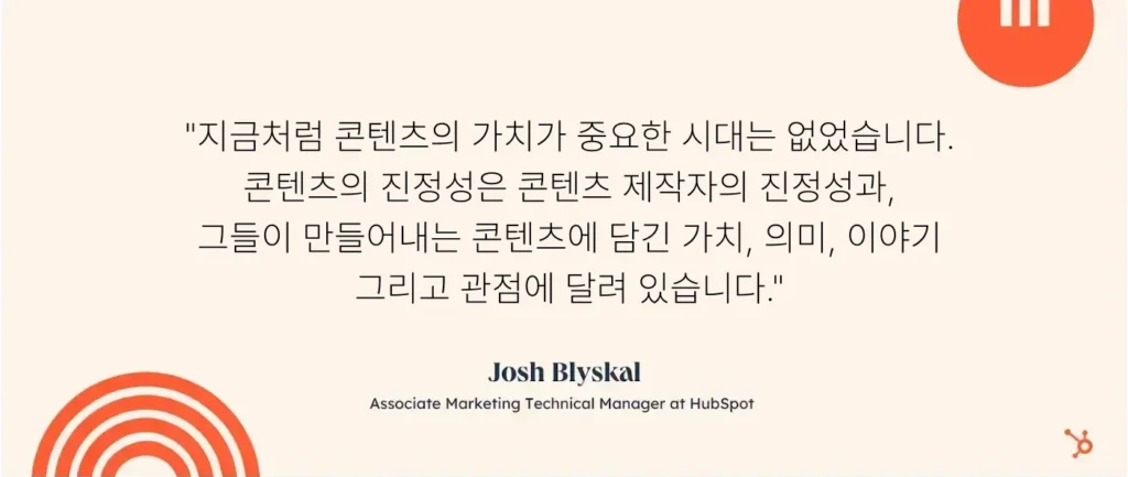 HubSpot의 Marketing Engineer였던 Josh Blyskal은 ‘지금은 그 어느 때보다도 콘텐츠의 가치가 중요한 시대’라고 합니다. 콘텐츠에 담긴 의미, 가치, 이야기, 그리고 제작자의 관점과 진정성에 콘텐츠의 진정성도 달려 있다는 거죠.