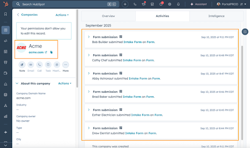 연결된 모든 연락처의 폼 제출 활동, 회사 타임라인에서 통합 확인 (Activity > Form Submissions 필터)