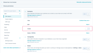 오브젝트별 생성 권한을 편집 권한과 분리(Contacts/Companies/Deals/Tickets/Custom Objects) 수동 생성만 적용, 워크플로/폼/인박스/이메일 추적/Salesforce sync 등 자동 생성 경로는 영향 없음