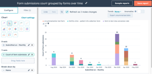 Forms/Form Submissions/Form Analytics를 다른 오브젝트(Contacts/Companies 등)와 조합 제출 추이/소스·캠페인별/전환율/신규 vs 재방문/라이프사이클·ICP 필터 등 대시보드 추가 포털에 데이터 소스 노출 지연 가능