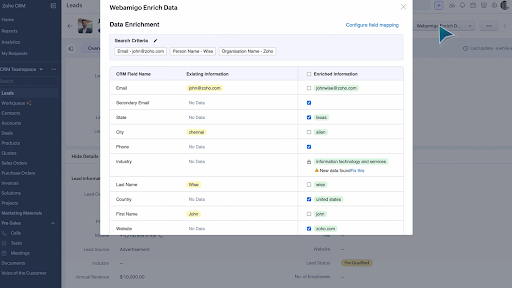 공개 데이터(전화번호, 이메일, 회사 정보 등) 검색 후 CRM 레코드에 자동/간편 보강, 데이터 강화 워크플로우 지원