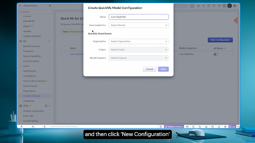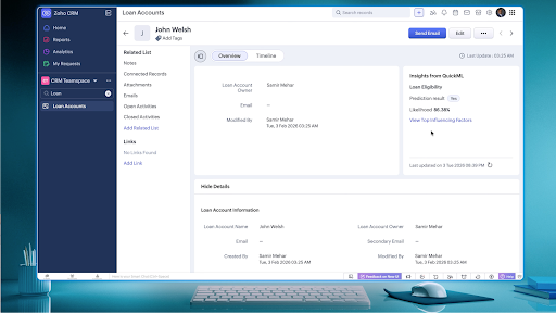 예측형 AI(QuickML) 모델을 CRM에 직접 연결, Custom AI Studio로 자체 모델 구축(예: 대출 승인 예측), 레코드 상세에서 승인 확률 등 인사이트 실시간 표시