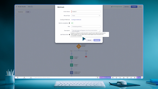 실패 경로 처리(Failure Path) 지원: 웹훅/함수 실행 ‘완료 대기’ 설정, 실패 시 대체 흐름 구성